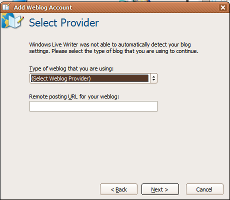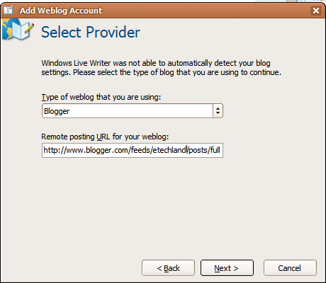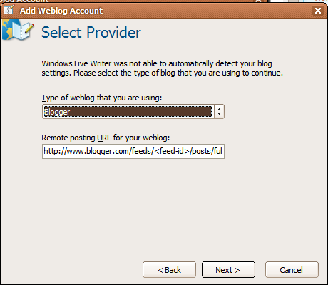 Alright. No problem. Let me choose my weblog service provider. Perhaps this should have been the first dialog to be shown anyways. I selected Blogger in the drop-down, and saw that the text field below got populated automatically: