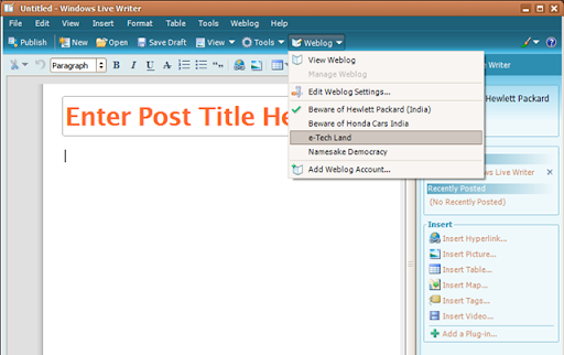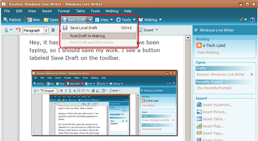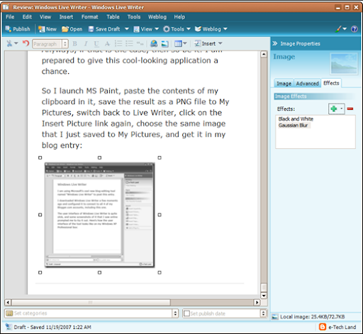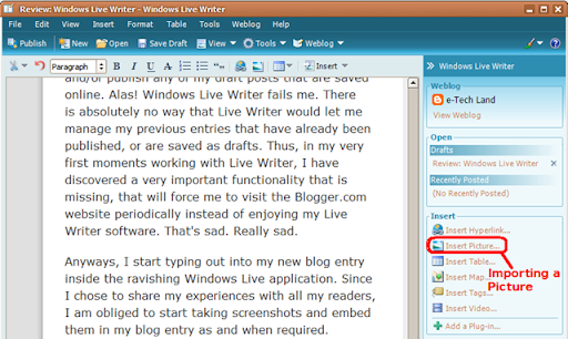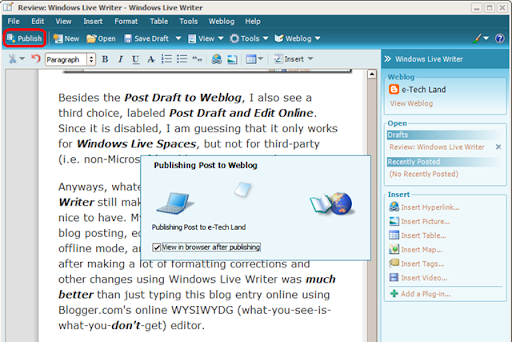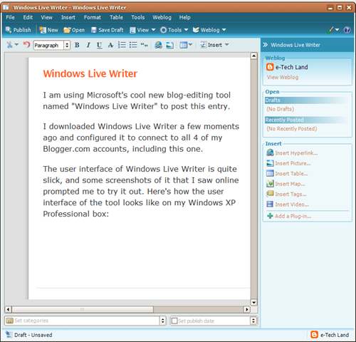 Anyways, I finally decided to try and post a new entry to my primary blog (e-Tech Land) to see how my editing experience with Windows Live Writer turned out.