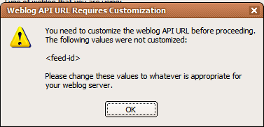 The <feed-id> field looked cryptic. I connected to the Blogger website and went over their help and FAQ to try and understand what I should set my feed-id to. When I found nothing, I decided to go ahead and try my luck anyways, and pressed Next. Sure enough, I was immediately presented with a dialog asking me to set <feed-id> to something.