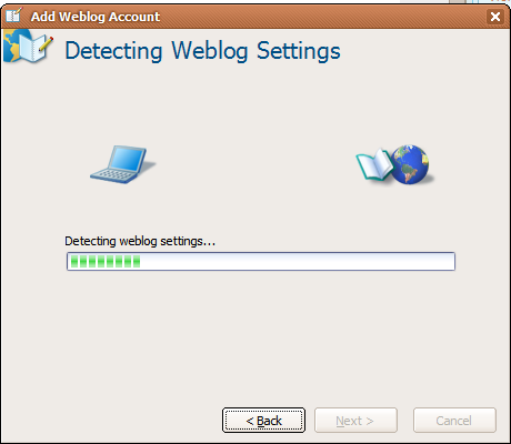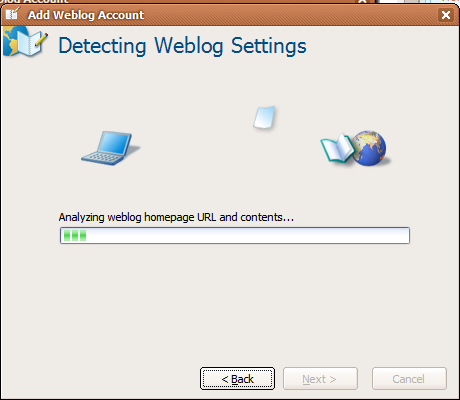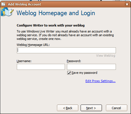The first dialog gives you a choice to setup either a Windows Live Spaces account, or a SharePoint weblog account, or a third-party account: