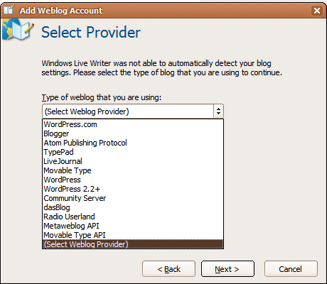 The screenshot below shows the full list of providers supported by Windows Live Writer: