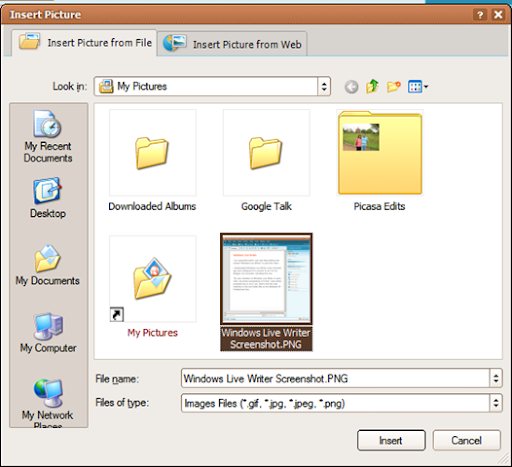 So I launch MS Paint, paste the contents of my clipboard in it, save the result as a PNG file to My Pictures, switch back to Live Writer, click on the Insert Picture link again, choose the same image that I just saved to My Pictures, and get it in my blog entry: